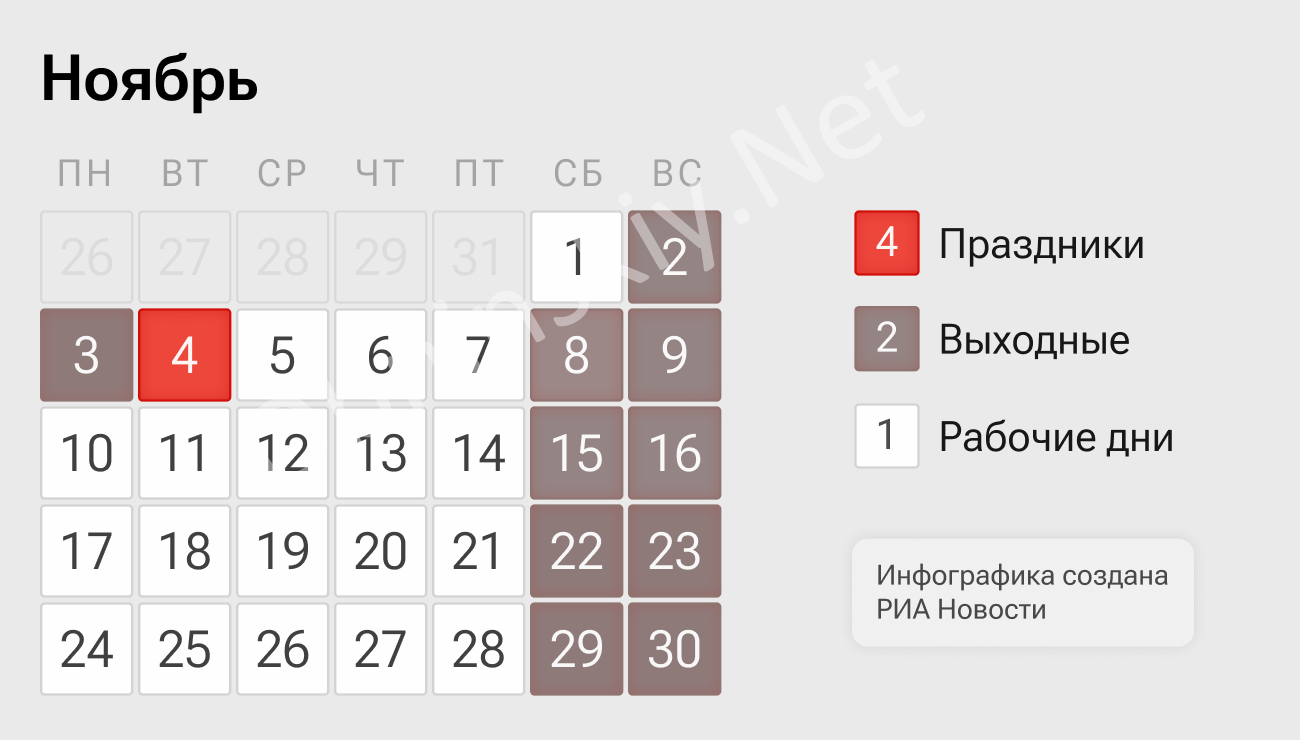 Суббота, 1 ноября - сокращённый рабочий день. Выходной переносится на понедельник - 3 ноября.